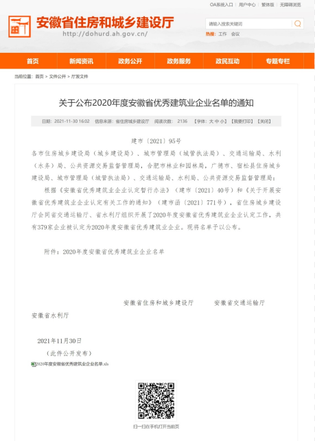 近日,安徽省住房城鄉(xiāng)建設廳公布2020年度安徽省優(yōu)秀建筑業(yè)企業(yè)名單,城建集團光榮上榜,榮獲“2020年度安徽省優(yōu)秀建筑業(yè)企業(yè)”榮譽稱號。