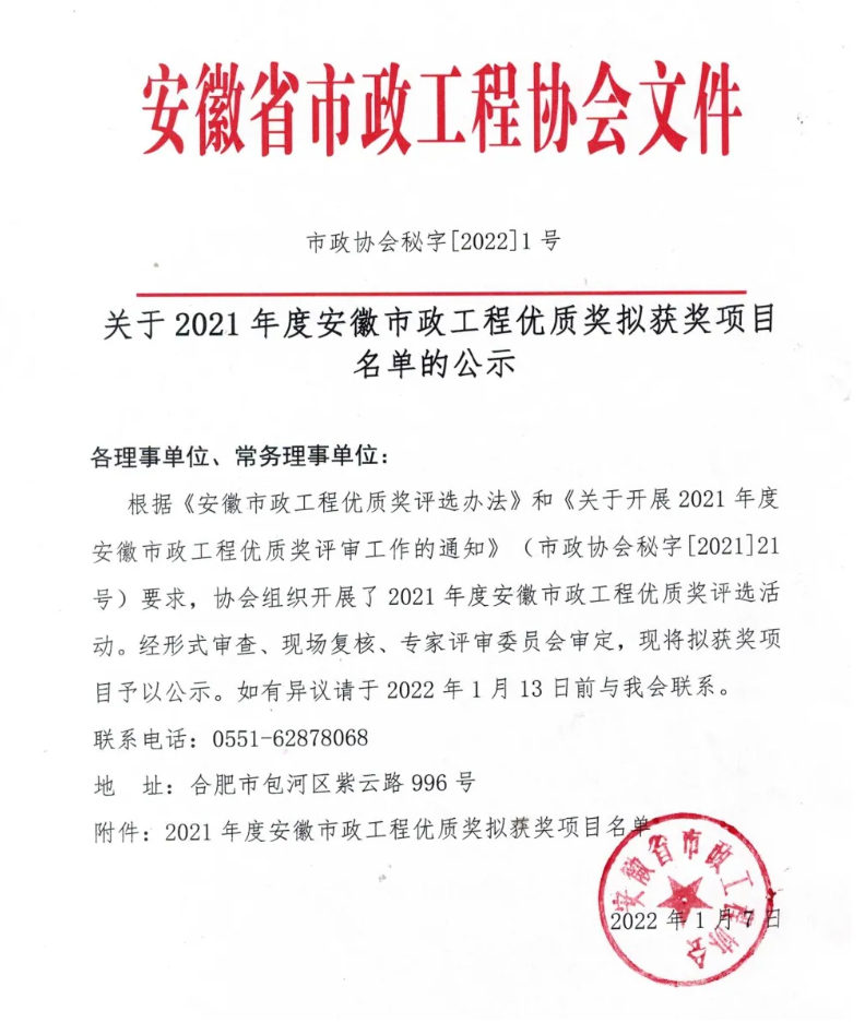 “安徽省市政工程優(yōu)質(zhì)獎”是安徽省市政工程質(zhì)量的最高榮譽獎項,是對市政工程技術(shù)及工藝水平先進(jìn)性和可行性最好的體現(xiàn)。2022年集團(tuán)將繼續(xù)提高管理水平、提升質(zhì)量標(biāo)準(zhǔn),向社會提供質(zhì)量可靠、群眾滿意的精品工程。