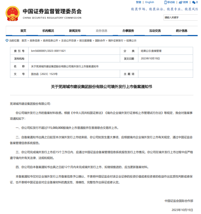 蕪湖城市建設(shè)集團(tuán)股份有限公司(以下簡(jiǎn)稱“蕪湖城建”或“公司”)于2023年10月收到中國(guó)證監(jiān)會(huì)國(guó)際合作部《關(guān)于蕪湖城市建設(shè)集團(tuán)股份有限公司境外發(fā)行上市備案通知書》,同意公司擬發(fā)行境外上市普通股并在香港聯(lián)合交易所上市,具體內(nèi)容如下: