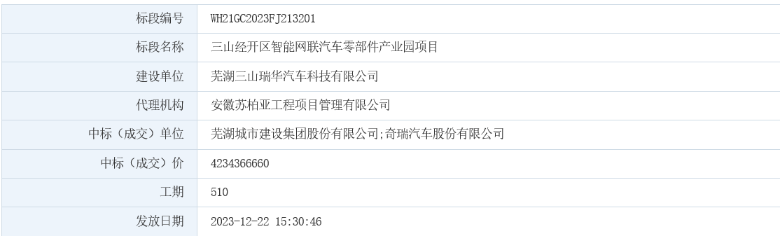 三山經(jīng)開區(qū)智能網(wǎng)聯(lián)汽車零部件產(chǎn)業(yè)園項(xiàng)目位于三山經(jīng)濟(jì)開發(fā)區(qū),地塊北至疏港路、西至橫山河路、南至長江南路,占地1620畝,主體包含1號聯(lián)合廠房、2號車間、3號車間及其配套工程的建設(shè)施工,生產(chǎn)生活設(shè)備的采購安裝調(diào)試等工程。該項(xiàng)目是蕪湖城市建設(shè)集團(tuán)股份有限公司與奇瑞汽車股份有限公司以聯(lián)合體形式于2023年12月22日中標(biāo)的項(xiàng)目,中標(biāo)金額達(dá)42.3億元!