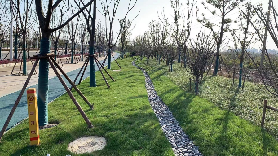 經(jīng)三路海綿由下沉式綠地、植草溝及溢流井組成,綠化主要包括喬灌木、球類、色塊地被,喬木有香樟、黃山欒樹等種類豐富,還配有四季時花,保證道路的四季景觀,并在多處設(shè)置有景觀小品。