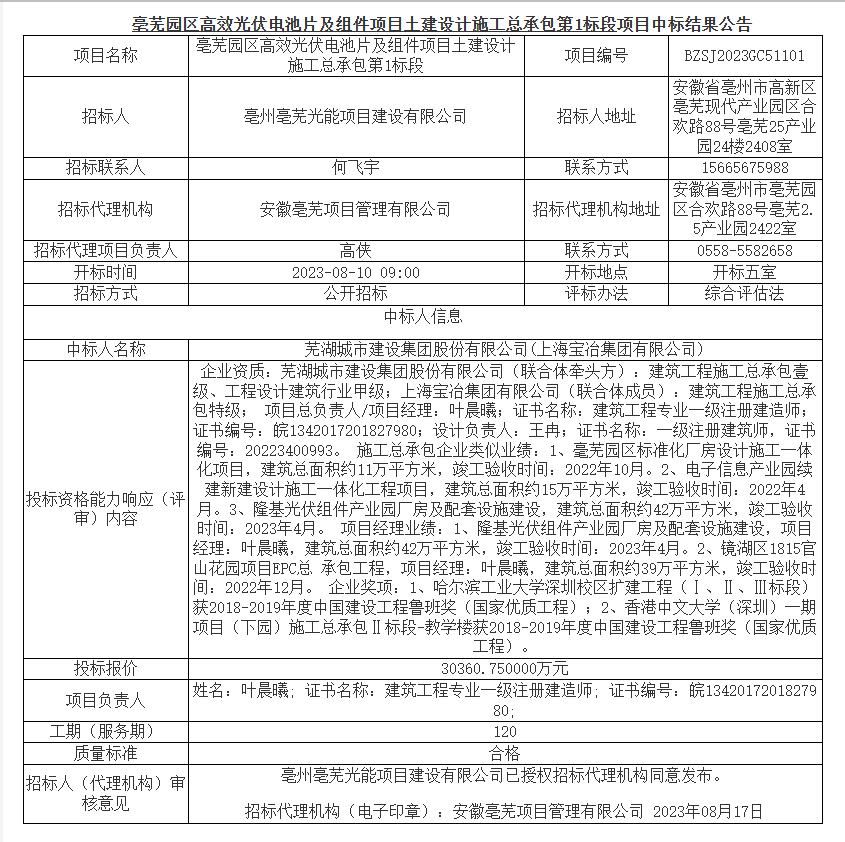 近日,蕪湖城市建設(shè)集團(tuán)股份有限公司緊跟國家可再生能源發(fā)展方向,以良好的信譽(yù)、雄厚的技術(shù)實(shí)力,加之優(yōu)秀的投標(biāo)方案和合理報(bào)價(jià),中標(biāo)亳蕪園區(qū)高效光伏電池片及組件項(xiàng)目土建設(shè)計(jì)施工總承包工程,中標(biāo)金額約為3億元!