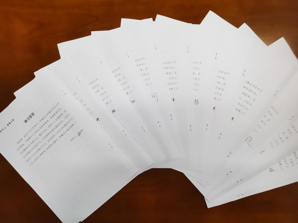 本次廉潔談話本著教育為先,預(yù)防在前的原則,向新員工宣讀了行賄受賄的相關(guān)法律,強調(diào)了廉政的重要性及必要性;下發(fā)了廉政教育手冊,帶領(lǐng)各位新員工學習了中央八項規(guī)定和六項禁令、公職人員禁令和國有企業(yè)工作人員履職風險點等內(nèi)容,引導新員工在政治上、思想上、行為上保持頭腦清醒、思想清晰,做到嚴于律己、清正廉潔。會上,岳書記以集團廉政標兵繞子法和泰州市墓園主任陳進的案例勉勵和警示新員工,他指出,反腐無僥幸,貪腐零容忍,要向榜樣看齊,向貪腐說不,常懷律已之心。最后,共讀《新入職員工一封信》,新員工在廉潔宣誓書上莊重地簽下自己的名字,表明堅守“廉之初心”的決心。