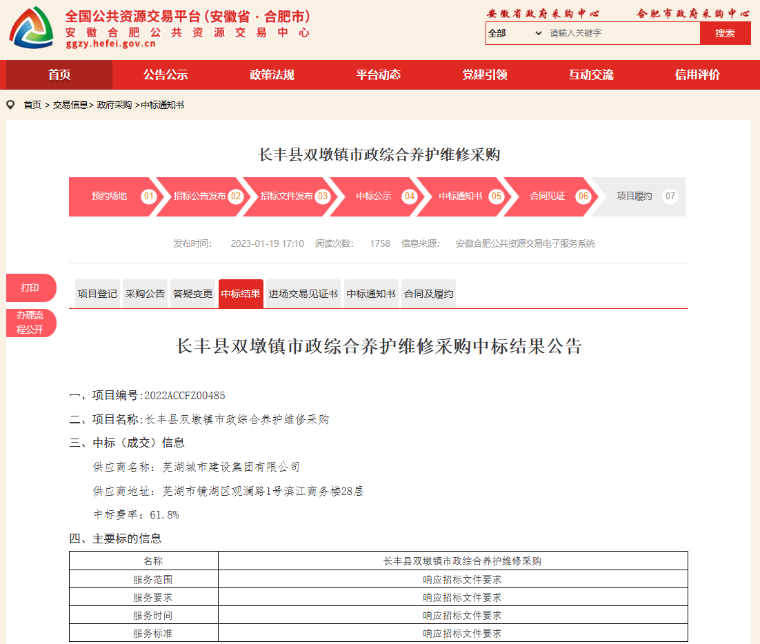 一年春作首,萬(wàn)事行為先!蕪湖城建集團(tuán)全面貫徹落實(shí)黨的二十大精神,按照集團(tuán)工作會(huì)議部署要求,開(kāi)好局、起好步,立足經(jīng)濟(jì)主戰(zhàn)場(chǎng),深耕合肥城市運(yùn)營(yíng)維護(hù)業(yè)務(wù)。在2023年新年伊始,阿米巴再傳佳訊,中標(biāo)長(zhǎng)豐縣雙墩鎮(zhèn)市政綜合養(yǎng)護(hù)維修采購(gòu)項(xiàng)目。