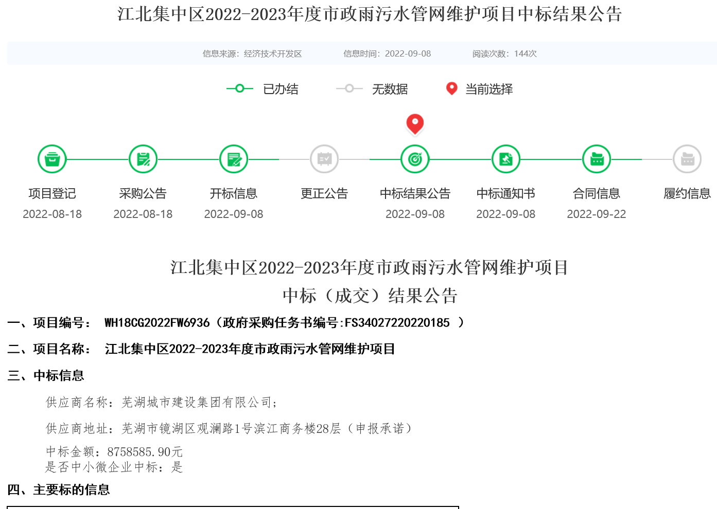 隨著城市經(jīng)濟(jì)建設(shè)的快速發(fā)展,地下雨污水管網(wǎng)不配套、設(shè)施老化等問(wèn)題日顯突出。9月,繼鏡湖區(qū)保興垾等水系底泥清淤項(xiàng)目后,集團(tuán)公司又中標(biāo)江北集中區(qū)2022-2023年度市政雨污水管網(wǎng)維護(hù)項(xiàng)目,中標(biāo)價(jià)875萬(wàn)元。