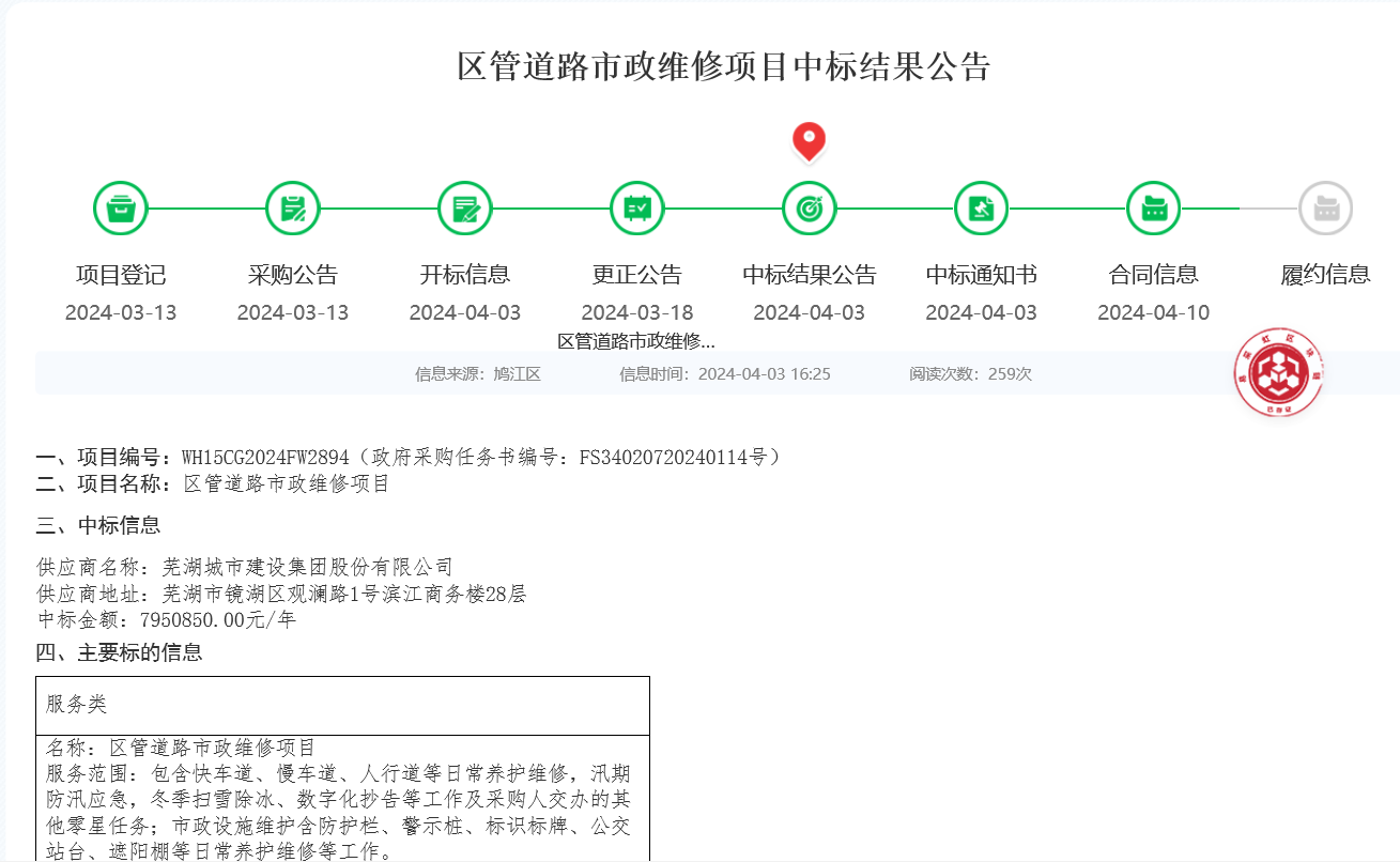 深耕細(xì)作篤前行,馳而不息謀發(fā)展。此次中標(biāo)是對(duì)蕪湖城建養(yǎng)護(hù)實(shí)力的肯定,我們將繼續(xù)打磨養(yǎng)護(hù)技能,不斷地完善知識(shí)體系,提高創(chuàng)新能力,為業(yè)主單位提供更優(yōu)質(zhì)的服務(wù),致力成為全國(guó)優(yōu)秀的市政基礎(chǔ)設(shè)施綜合運(yùn)營(yíng)商。