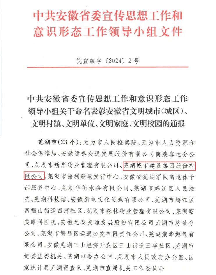 近日,中共安徽省委宣傳思想工作和意識(shí)形態(tài)工作領(lǐng)導(dǎo)小組發(fā)布《關(guān)于命名表彰安徽省文明城市(城區(qū))、文明村鎮(zhèn)、文明單位、文明家庭、文明校園的通報(bào)》,蕪湖城市建設(shè)集團(tuán)股份有限公司喜獲“第十三屆安徽省文明單位”榮譽(yù)稱號(hào)。這是我集團(tuán)繼獲評(píng)“市級(jí)文明單位”之后,首次榮獲“省級(jí)文明單位”殊榮,也是蕪湖市唯一一家獲此殊榮的建筑業(yè)單位。
